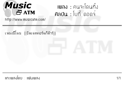 คอร์ดเพลง คนจะโดนทิ้ง - โบกี้ ดอดจ์ Version 15 แกะโดย แฟนเพลง เมื่อ 13 ก.ค.2547,19:39น. ดู 840 ครั้ง แชร์ 0 0 พิมพ์คอร์ด เปลี่ยนคีย์ -6 -5 -4 -3 -2 -1 คีย์ปกติ +1 +2 +3 +4 +5 +6 5 เพลงนี้โดน ((อัพเดทคอร์ดกีต้าร์)) เขียน Tab ช่วยกันปรับปรุงคอร์ด เปรียบเทียบแต่ละเวอร์ชั่น แสดงคอร์ดเพลงเป็นแบบข้อความ ความคิดเห็นเกี่ยวกับคอร์ดนี้ คลิกที่รูป เพื่อแทรกรูปลงในข้อความ โพสต์ความคิดเห็น แสดงเพิ่มเติม แสดงเพิ่มเติม