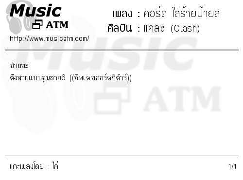 คอร์ดเพลง คอร์ด ใส่ร้ายป้ายสี - แคลช (Clash) Version 13 แกะโดย ไก่ เมื่อ 14 ส.ค.2547,22:26น. ดู 536 ครั้ง แชร์ 0 0 พิมพ์คอร์ด เปลี่ยนคีย์ -6 -5 -4 -3 -2 -1 คีย์ปกติ +1 +2 +3 +4 +5 +6 5 ช่ายฮะตั้งสายแบบจูนสาย6 ((อัพเดทคอร์ดกีต้าร์)) ดู Tab (2) ช่วยกันปรับปรุงคอร์ด เปรียบเทียบแต่ละเวอร์ชั่น แสดงคอร์ดเพลงเป็นแบบข้อความ ความคิดเห็นเกี่ยวกับคอร์ดนี้ คลิกที่รูป เพื่อแทรกรูปลงในข้อความ โพสต์ความคิดเห็น แสดงเพิ่มเติม แสดงเพิ่มเติม