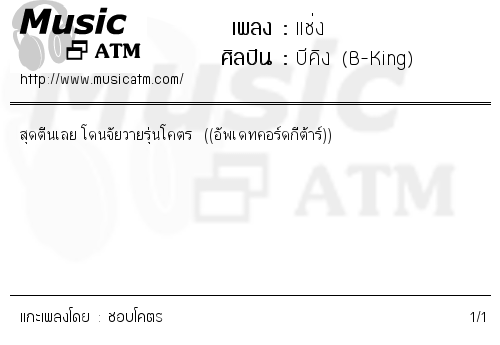 คอร์ดเพลง แช่ง - บีคิง (B-King) Version 9 แกะโดย ชอบโคตร เมื่อ 31 ส.ค.2547,17:21น. ดู 783 ครั้ง แชร์ 0 0 พิมพ์คอร์ด เปลี่ยนคีย์ -6 -5 -4 -3 -2 -1 คีย์ปกติ +1 +2 +3 +4 +5 +6 5 สุดตีนเลย โดนจัยวายรุ่นโคตร ((อัพเดทคอร์ดกีต้าร์)) เขียน Tab ช่วยกันปรับปรุงคอร์ด เปรียบเทียบแต่ละเวอร์ชั่น แสดงคอร์ดเพลงเป็นแบบข้อความ ความคิดเห็นเกี่ยวกับคอร์ดนี้ คลิกที่รูป เพื่อแทรกรูปลงในข้อความ โพสต์ความคิดเห็น แสดงเพิ่มเติม แสดงเพิ่มเติม