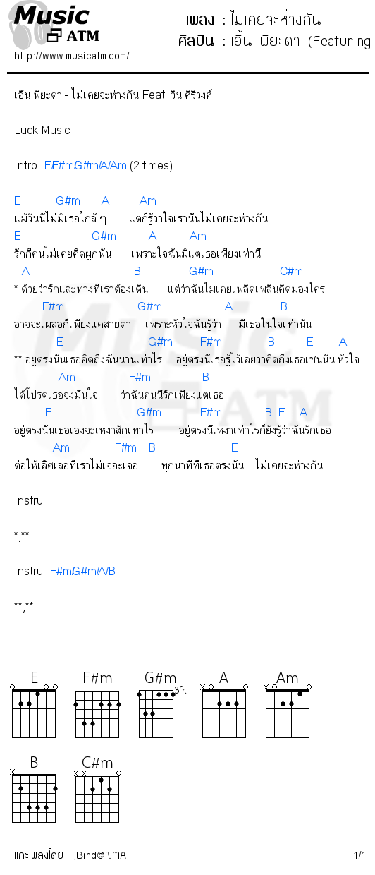 คอร์ดเพลง ไม่เคยจะห่างกัน - เอิ้น พิยะดา (Featuring วิน ศิริวงศ์)