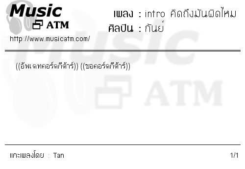 คอร์ดเพลง intro คิดถึงมันผิดไหม - กันย์ Version 5 แกะโดย Tan เมื่อ 7 ก.ค.2547,22:36น. ดู 1931 ครั้ง แชร์ 0 0 พิมพ์คอร์ด เปลี่ยนคีย์ -6 -5 -4 -3 -2 -1 คีย์ปกติ +1 +2 +3 +4 +5 +6 5 ((อัพเดทคอร์ดกีต้าร์)) ((ขอคอร์ดกีต้าร์)) ดู Tab ช่วยกันปรับปรุงคอร์ด เปรียบเทียบแต่ละเวอร์ชั่น แสดงคอร์ดเพลงเป็นแบบข้อความ ความคิดเห็นเกี่ยวกับคอร์ดนี้ คลิกที่รูป เพื่อแทรกรูปลงในข้อความ โพสต์ความคิดเห็น แสดงเพิ่มเติม แสดงเพิ่มเติม