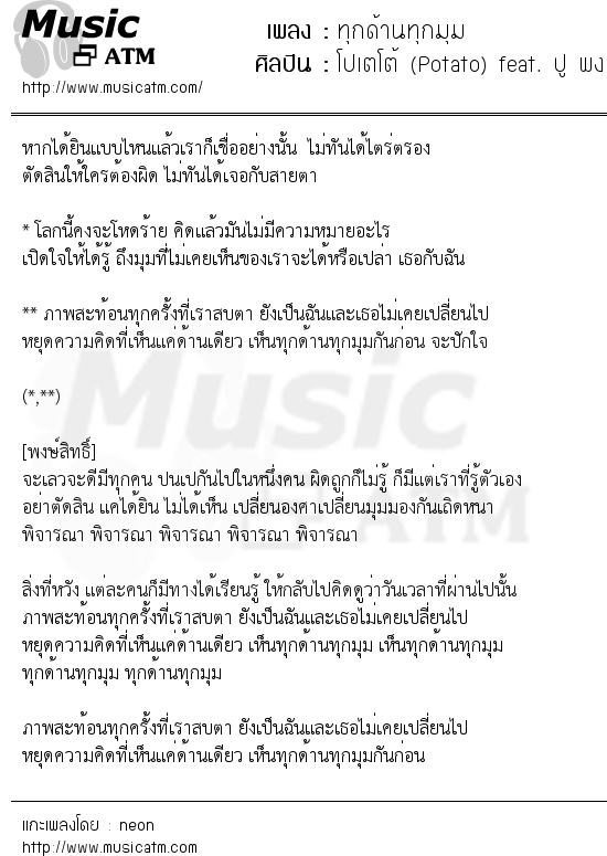 เนื้อเพลง ทุกด้านทุกมุม - โปเตโต้ (Potato) feat. ปู พงษ์สิทธิ์ คำภีร์