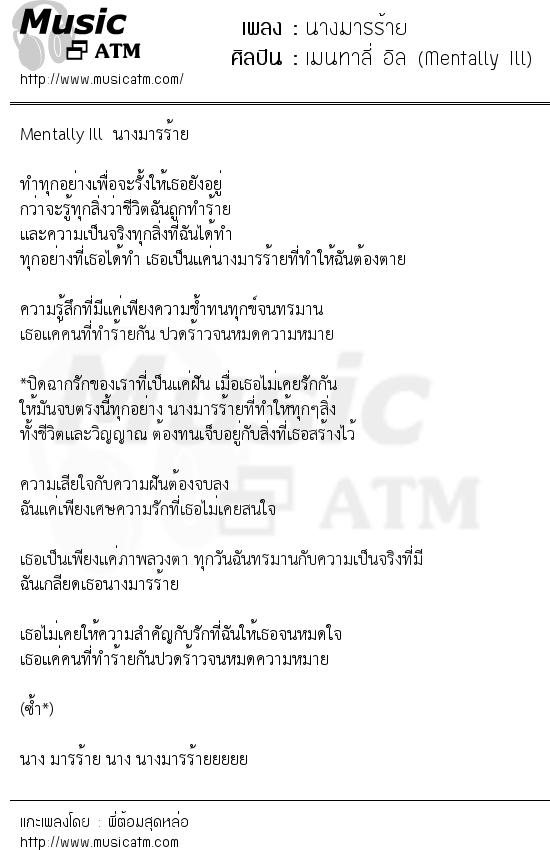 เนื้อเพลง นางมารร้าย - เมนทาลี่ อิล (Mentally Ill)