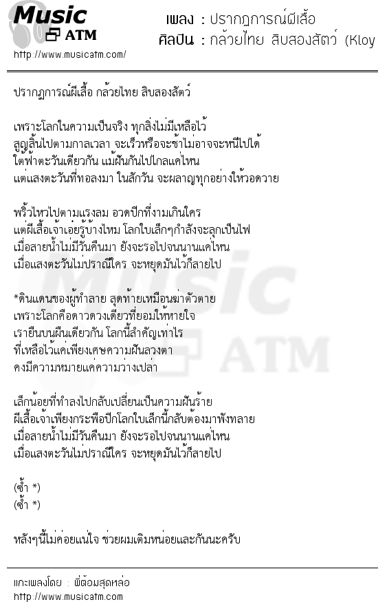 เนื้อเพลง ปรากฏการณ์ผีเสื้อ - กล้วยไทย สิบสองสัตว์ (Kloy thai)