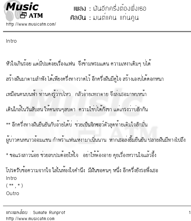 โปรดรับข้อความจากใจ ใส่ในห้องใจคำนึง มีฝันขอคนๆ หนึ่ง อีกครึ่งยังรอพึ่งเธอ