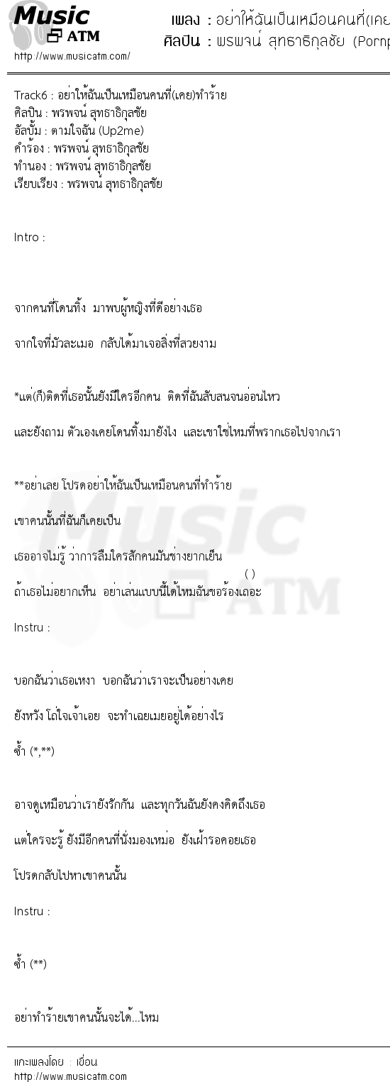 เนื้อเพลง อย่าให้ฉันเป็นเหมือนคนที่(เคย)ทำร้าย (Album Version) - พรพจน์ สุทธาธิกุลชัย (Pornpodj Sudthathikhulchai)