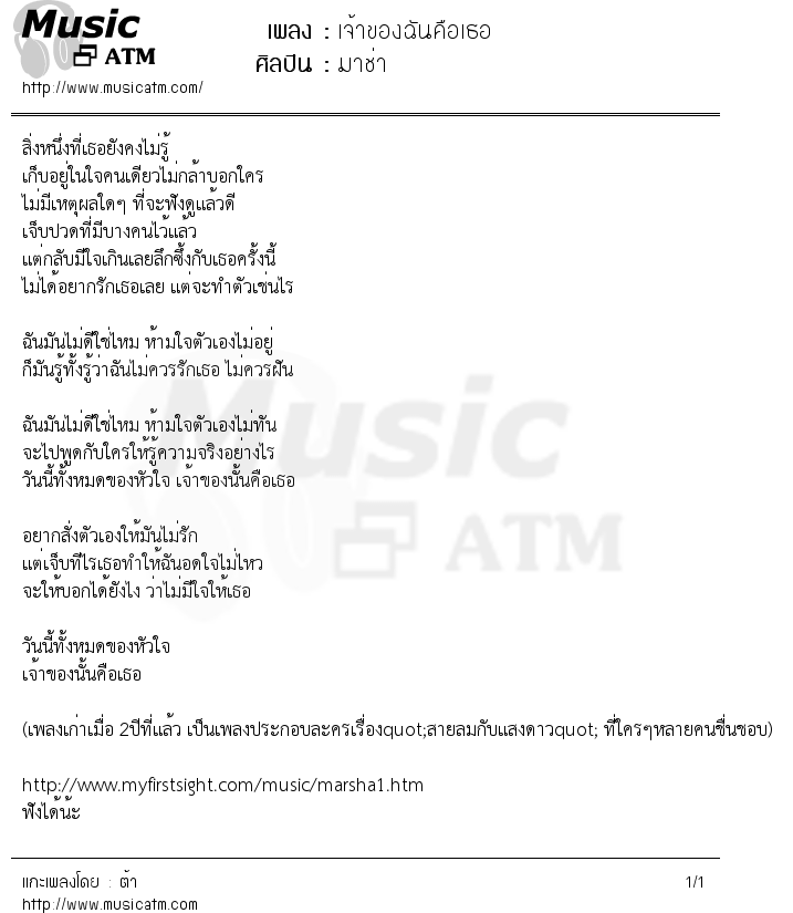 เนื้อเพลง เจ้าของฉันคือเธอ - มาช่า